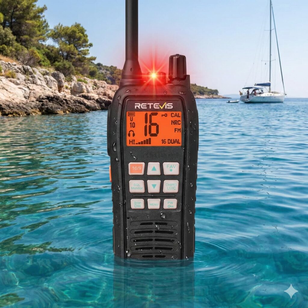 Retevis RM15 ne samo da pluta na površini vode, već ima i ugrađeni senzor koji detektira vodu. U trenutku kada stanica dotakne more, automatski se pali snažna LED bljeskalica (crveno svjetlo), čak i ako je stanica bila isključena!